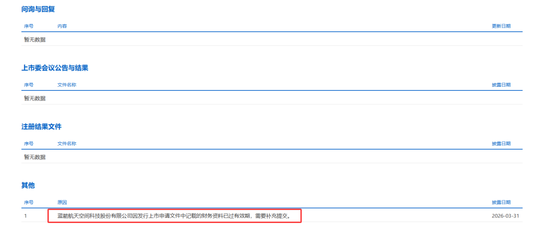 此次蓝箭航天IPO的“中止”,直接原因是发行上市申请文件中记载的财务资料已过有效期,需要补充提交。