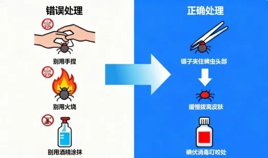 牢记“不捏不烧不涂酒,镊子拔头消消毒”。不可用手直接碾碎或拔取,可用镊子贴近皮肤夹住蜱虫,平稳缓慢拔出,再用碘伏彻底消毒叮咬处,若有残留需及时就医。